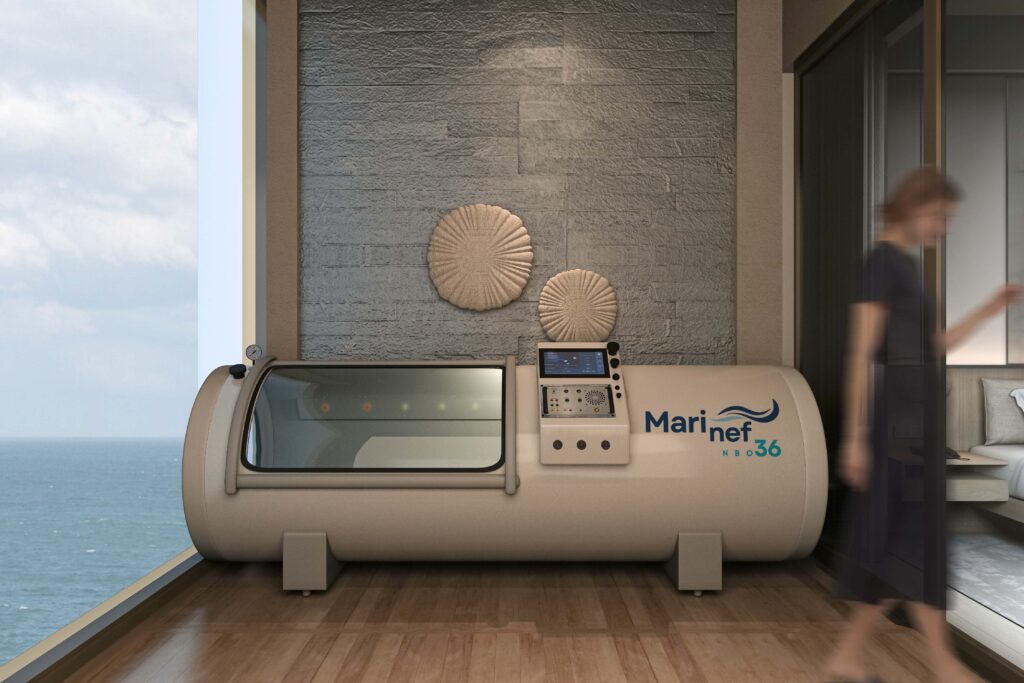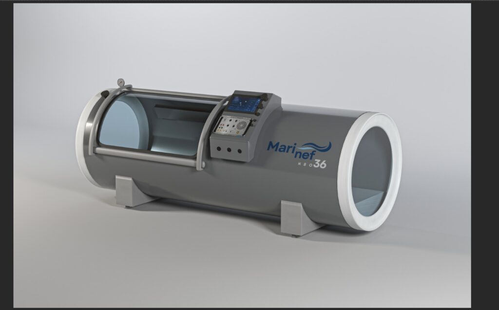 Marinef Nef36 karbon çelik ve alüminyum malzemeden yapılmış, çok sağlam Hiperbarik oksijen odasıdır. 89 inç uzunluk, 36 inç çap, kişisel kullanım için mükemmel boyut.
