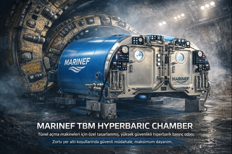 MARINEF TBM Hyperbaric Chamber, tünel açma makineleri (TBM) içerisinde konumlandırılmak üzere tasarlanmış, yüksek güvenlikli özel basınç odası (pressure chamber) sistemidir. TBM operasyonları sırasında bakım, kesici kafa müdahalesi ve acil durumlar için personelin kontrollü şekilde hiperbarik ortama alınmasını sağlar.